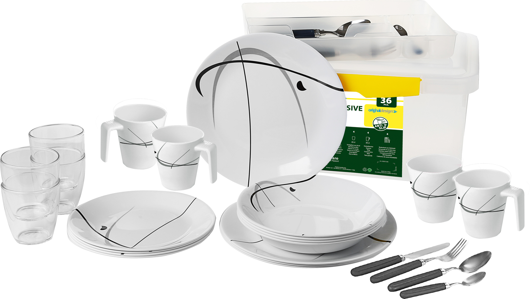36 darabos étkészlet, törhetetlen műanyagból, tárolódobozzal.