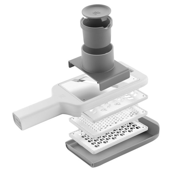 Ez a kompakt, univerzális konyhai eszköz egyben multifunkciós vágó, zöldségszeletelő és kézi reszelő is. Négy cserélhető pengéjével (finom, közepes, durva és szeletelő) a reszelő ugyanolyan könnyedén dolgozza fel a gyümölcsöket és zöldségeket, mint a kemény sajtokat, dióféléket vagy csokoládét. A szabadalmaztatott Z-Cut reszelőtechnológiának, az előszeletelésnek és a kétirányú funkcióknak köszönhetően könnyedén és könnyedén falatnyi adagokra vághatja az élelmiszereket. Egyszerűen helyezze az élelmiszert a levehető ételfeltétbe, és kezdje el a reszelést. A beépített ujjvédő biztosítja, hogy ne legyen sérülésveszély. A kivehető gyűjtőtartály gumírozott aljával csúszásmentes fogást és jobb irányítást biztosít reszelés közben. A reszelő mosogatógépben mosható a könnyű tisztítás érdekében.