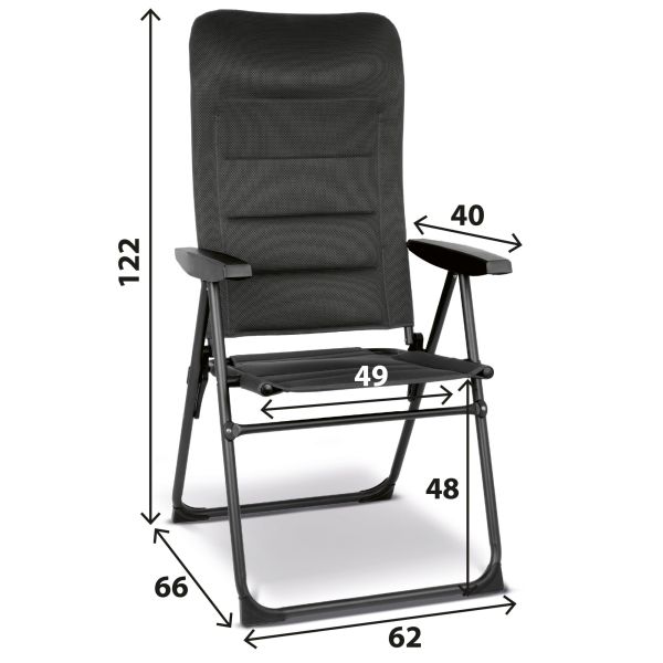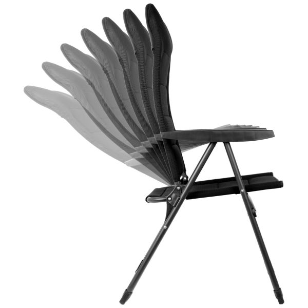 Magas, 7 pozícióban állítható háttámla, klasszikus U-alakú váz, magas stabilitás puha talajon is. Porszórt alumíniumváz, strapabíró 3D szövetű ülőfelülettel.