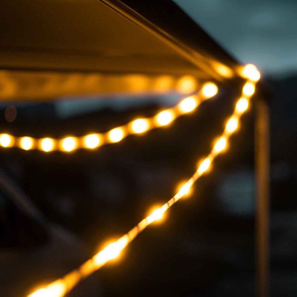 Funkcionális világítás kempingezéshez és szabadtéri tevékenységekhez Ez a fényfüzér a meleg fehér fényt a magas funkcionalitással ötvözi. Akár 150 kg-os teherbírásával és időjárásálló anyagával ideális napellenzők rögzítéséhez, ruhaszárító kötélként vagy egyéb célokra. A beépített lámpa további biztonságot nyújt sötétben. A 6 m hosszú LED-füzér folyamatosan szabályozható és USB-C-n keresztül működik – kompatibilis külső akkumulátorokkal, mobiltelefon-adapterekkel vagy lakókocsikban fixen beépített aljzatokkal. A csomag tartalmaz egy praktikus szárazzsákot a külső akkumulátor tárolására vagy védelmére.